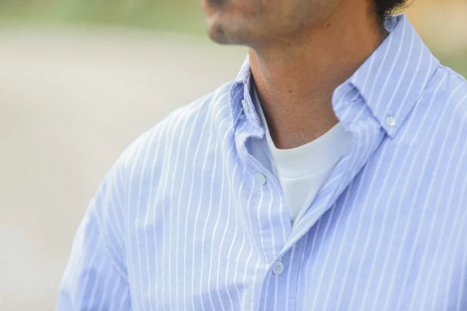 Chemise à col boutonné 100% coton. Nouvelle coupe aux volumes modernes dans un très bel oxford rayé au poids de 170 gr/m2. Le col est plus haut que nos cols habituels et un soufflet dans le dos ajoute une touche retro.