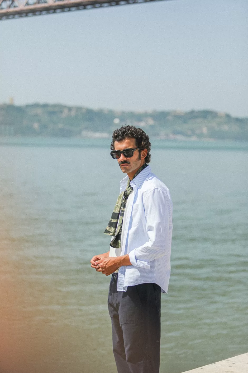 Pour sublimer nos silhouettes Drapeau Noir, nous avons développé une gamme d’accessoires comme ce foulard en tissu Ripstop au motif « tiger stripes » popularisé pendant la guerre du Viêt Nam. Issu de l’univers militaire, ce tissu présente une armure en quadrillage visible sur l’envers qui lui apporte une grande résistance.